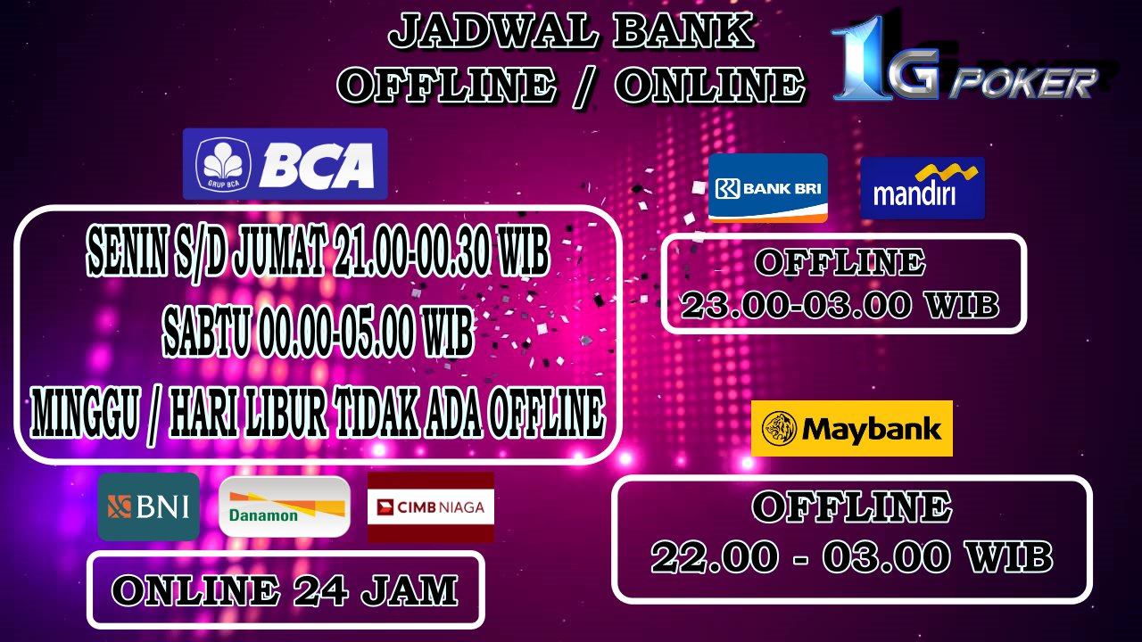 Jadwal Offline Bank BCA, Mandiri, BNI, BRI, Danamon, CIMB ... Jadwal offline bank perlu diketahui nasabah agar tidak melakukan transaksi di jam tersebut. Transferan pending sering dialami nasabah saat bank offline , termasuk saya sendiri. Kebetulan saya adalah nasabah aktif bank BCA, BNI, Mandiri, BRI dan CIMB Niaga. Jadwal Offline Bank BCA, BNI, BRI, dan Mandiri Jadwal Offline Bank BCA, BNI, BRI, dan Mandiri. Jadwal Offline BCA . Pada hari Senin-Jum'at BCA biasanya akan Offline Pukul 21:00-01:00 WIB ; Hari Sabtu Bank BCA offline lebih cepat yaitu Pukul 18:00-20:00 WIB dan offline lagi pukul 21:00-01:00 WIB Jadwal Offline Bank Bca Dewa Poker - green-lg.com Jadwal Offline Bank Bca Dewa Poker, Poker Ellipse Spandau, The Poker Sites, Poker Face Watches