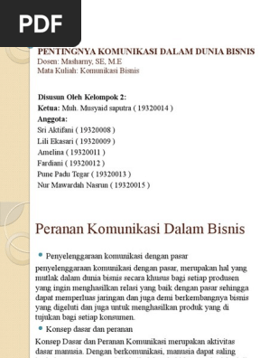 Peranan Komunikasi Dalam Bisnis - Kompasiana.com Peranan Komunikasi dalam Bisnis a. Komunikasi dengan Pasar Dengan timbulnya situasi Economic of relatif plenty, dewasa ini setiap pengusaha harus berusaha untuk dapat menutup jurang yang terbentang antara produsen dengan masyarakat konsumen selaku calon pembeli atau pemakai barang atau jasa yang dihasilkannya. PERANAN KOMUNIKASI DALAM DUNIA BISNIS - devita I. Peranan Komunikasi dalam Bisnis Berikut merupakan beberapa hal yang membuat komunikasi menjadi penting dalam bisnis menurut Wiley, yaitu: Pelatihan dan recruitmen karyawan Hubungan dengan para karyawan Penjualan dan promosi Pelaporan pada manajemen Pelaporan pada pemegang saham II. Tujuan Komunikasi dalam Dunia Bisnis Peranan Komunikasi dalam Dunia Bisnis - dianmaharanii Fungsi komunikasi bisnis terdiri dari fungsi informative, regulatory, persuasive, integrative. Dalam komunikasi bisnis, terdapat beberapa tujuan tertentu. Berikut ini adalah beberapa tujuan komunikasi bisnis yakni : 1. Meningkatkan goodwill (nama baik) perusahaan. 2. Meningkatkan hubungan baik perusahaan dengan masyarakat. 3.