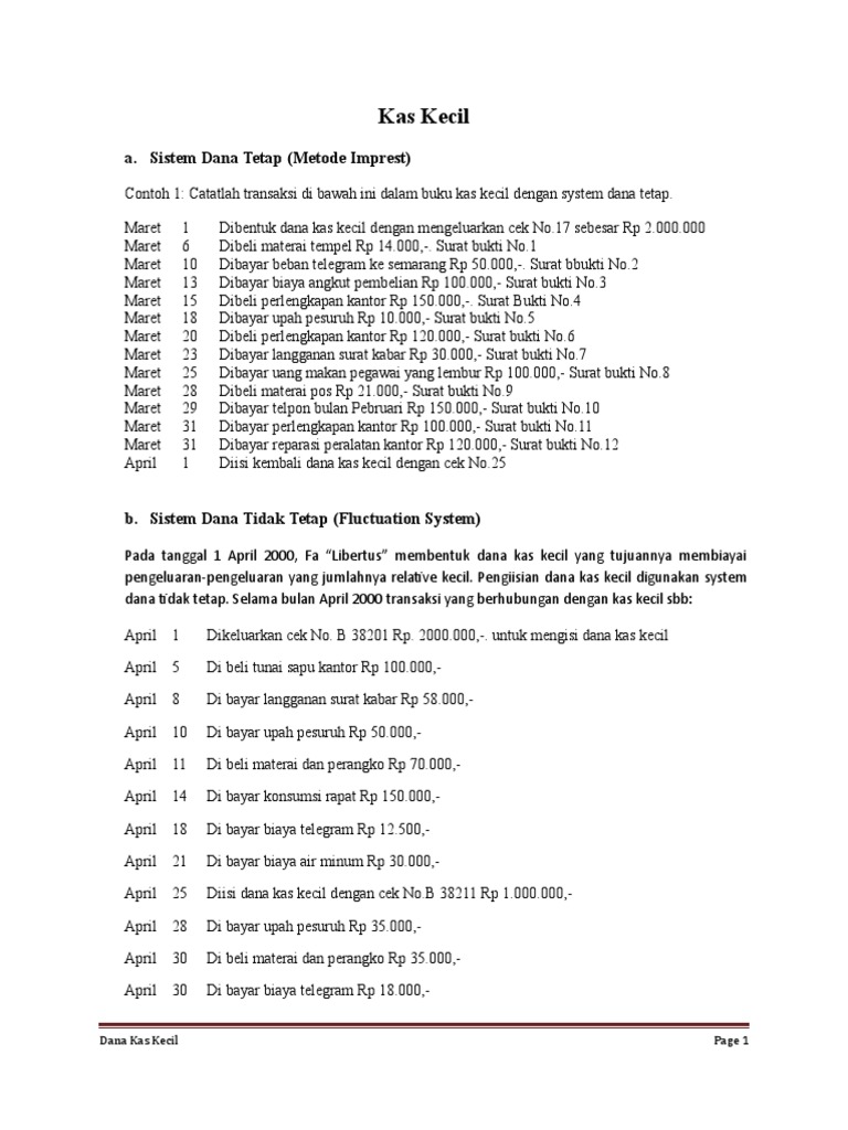PDF Akuntansi Keuangan 1 a. Sistem Dana Tetap (Imprest Fund System). Artinya sepanjang jumlah dana yang telah ditetapkan dianggap cukup untuk pengeluaran-pengeluaran kas kecil selama periode tertentu, jumlah dana kas kecil tidak dinaikkan atau diturunkan. b. Sistem Dana Tidak Tetap ( Fluctuation Fund System).