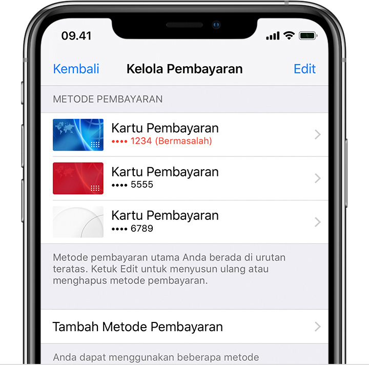 Metode Pembayaran - Apple (ID) - Apple (Indonesia) Semua cara mudah untuk membayar game, musik, film, dan banyak lagi. Begitu mudah membayar hal-hal yang Anda sukai dari perangkat. Cukup siapkan metode pembayaran — eWallet, atau kartu kredit atau debit — dan langsung gunakan. Anda juga bisa mengelola beberapa langganan dan pembelian untuk keluarga Anda, di seluruh perangkat Apple Anda.