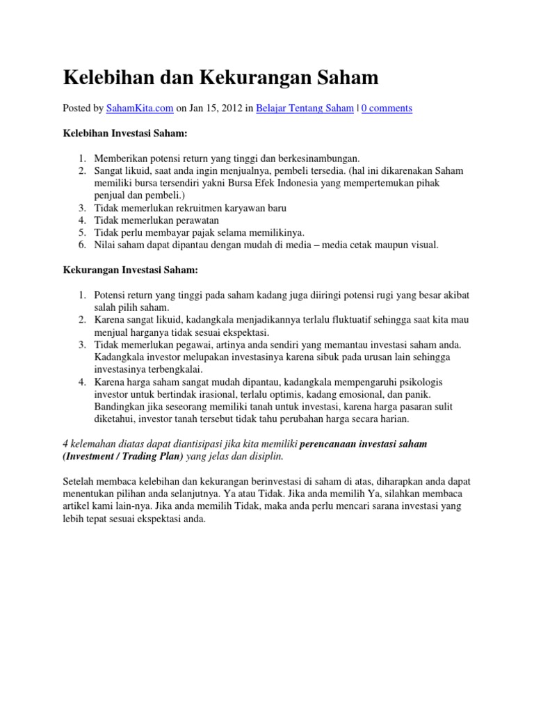 17 Kelebihan dan Kekurangan Investasi Saham Yang Harus ... Kelebihan dan Kekurangan Investasi Saham Berikut daftar dari kelebihan dan kekurangan investasi saham. Kelebihan : Membeli dan menjual saham dapat memberi Anda banyak keuntungan seperti obligasi dan beberapa alternatif lain. Pengembalian tahunan untuk investasi ini lebih dari 100% dalam banyak kasus.