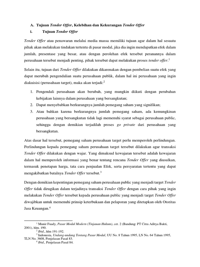 Tender Offer - Pengertian, Tujuan dan Contohnya - Dosen ... Pengertian Tender Offer. Sebagai seorang investor saham, kita hendaknya memahami berbagai istilah saham, salah satunya adalah tender offer.Tender offer adalah penawaran yang diajukan oleh suatu pihak baik perseorangan ataupun perusahaan untuk mendapatkan saham sebuah perusahaan dengan cara pembelian melalui media massa seperti televisi, radio, surat kabar dan media lainnya.