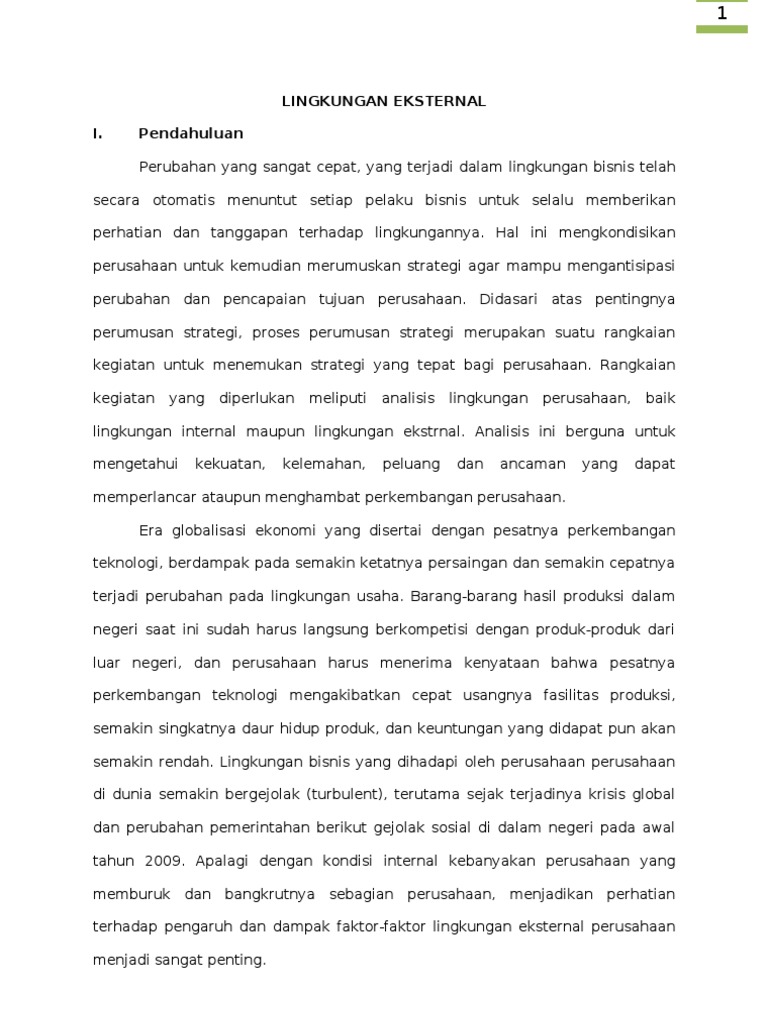 Pengaruh Lingkungan Eksternal, Internal dan Etika Bisnis ... Kontigensi Volume 2, No. 2, Nopember 2014, Hal. 68 - 88 ISSN 2088-4877 68 Pengaruh Lingkungan Eksternal, Internal dan Etika Bisnis terhadap Kemitraan Usaha serta Implikasinya pada Kinerja Usaha Kecil (Doc) Pertemuan 3: Lingkungan Eksternal Perusahaan ... Menguraikan kluster dan konsep persaingan terkini B. URAIAN MATERI Lingkungan Bisnis Lingkungan bisnis memiliki arti yang luas karena menunjukkan seluruh pengaruh eksternal terhadap organisasi. Memiliki tiga konsep, yaitu 1) fakta objektif, 2) fakta subjektif, 3) pembagian antara organisasi dan lingkungan tidak jelas, dan lingkungan tercipta ...