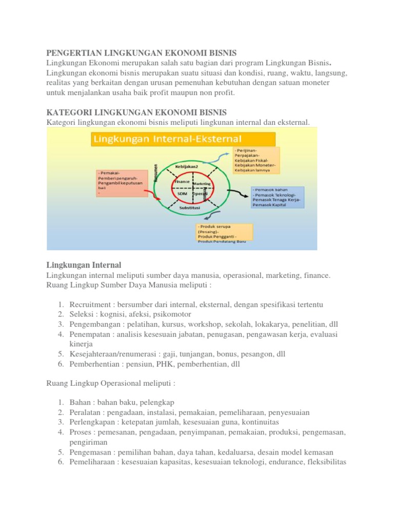 Lingkungan Bisnis: Pengertian, Jenis, dan Manfaat Memahami ... 2.8 8. Lingkungan Bisnis Membantu Beradaptasi dengan Perubahan yang Cepat. 2.9 9. Lingkungan Bisnis Membantu Perencanaan dan Penetapan Kebijakan. 2.10 Faktor Dalam dan Luar yang Mempengaruhi Lingkungan Bisnis. 2.11 Faktor Internal Lingkungan Binsis. 2.12 Faktor Eksternal Lingkungan Bisnis. 3 Penutup. Etika Bisnis Bisnis dan Lingkungan Eksternal dan Internal Lingkungan organisasi dapat dibedakan atas lingkungan eksternal dan lingkungan internal. Lingkungan eksternal terdiri atas faktor-faktor yang mempengaruhi organisasi dari luar batas organisasi, sedangkan lingkungan internal meliputi faktor-faktor yang ada di dalam organisasi yang berpengaruh terhadap manajemen organisasi. Pengertian Bisnis Internal dan Eksternal - Pengantar ... Pengertian Bisnis Internal dan Eksternal Lingkungan bisnis adalah segala sesuatu yang mempengaruhi aktivitas bisnis dalam suatu lembaga organisasi atau perusahaan. Faktor - factor yang mempengaruhi tersebut tidak hanya dalam perusahaan (intern), namun juga dari luar (ekstern). Oleh karena itu, lingkungan bisnis diklasifikasikan menjadi 2 macam, yaitu : 1. Lingkungan Bisnis: Pengertian, Jenis, dan Contohnya Dalam lingkungan bisnis internal dan eksternal, terdapat faktor penting lain yang mempengaruhi analisis lingkungan bisnis antara lain: Media massa, Pemasaran, Ekonomi makro, Penggunaan teknologi, Kebijakan pemerintah. Salah satu contoh faktor dari kebijakan pemerintah yang mempengaruhi lingkungan bisnis adalah mengenai cukai rokok.