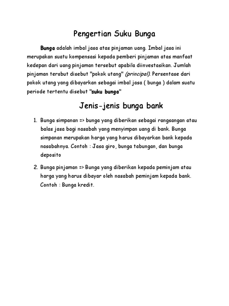 Suku Bunga: Pengertian, Jenis, Teori, Tipe, Peran & Contoh Pengertian Suku Bunga Baca Cepat Buka Bunga ialah tip jasa atas kredit uang. Profit dari utama utang yang dibayarkan sebagai tip jasa atau bunga dalam suatu waktu spesifik yang disebut dengan suku bunga. Suku bunga ialah suatu merespons jasa dari aset yang ditimbunkan atau dikreditkan kepada suatu pihak dalam bentuk profit.