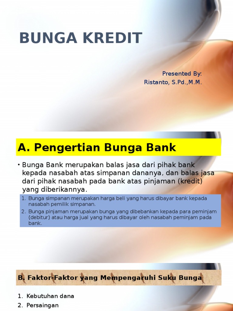 Pengertian suku bunga kredit. Pengertian Suku Bunga - Content Suku bunga kerap kali dikaitkan dengan dunia perbankan. Pengertian suku bunga menurut sunariyah (2013:80) adalah "harga dari pinjaman. Suku bunga bank, pengertian, jenis, dan cara perhitungannya. Suku bunga dasar kredit atau prime lending rate adalah suku bunga dasar paling rendah di mana bank belum menghitung premi resiko dari kredit tersebut. Jenis-jenis Pembebanan Suku Bunga Kredit - euisnuraidah Jenis-jenis Pembebanan Suku Bunga Kredit. Metode pembebanan bunga antara lain: 1. Pembebanan bunga setiap bulan dihitung dari sisa pinjamannya sehingga jumlah bunga yang dibayar nasabah setiap bulan menurun seiring dengan turunnya pokok pinjaman. Jenis sliding rate ini biasanya diberikan kepada sektor produktif. Apa Itu Suku Bunga Kredit dan Pengaruhnya pada Pinjaman? Sep 09, 2017 · Pengertian suku bunga kredit Nah, kalau suku bunga kredit adalah suatu harga yang harus dibayarkan oleh debitur kepada bank atas pinjaman yang telah diberikan. Untuk pihak bank, suku bunga kredit merupakan harga jual yang akan dibebankan kepada para debitur. Manfaat suku bunga kredit bagi bank adalah untuk mendapatkan keuntungan. Mengenal Jenis-jenis Suku Bunga Bank .:: SIKAPI Asumsi bahwa suku bunga kredit tidak berubah (tetap) selama jangka waktu kredit. Maka perhitungan angsurannya secara rinci adalah sebagai berikut: 4. Suku bunga efektif Suku bunga efektif adalah suku bunga yang diperhitungkan dari sisa jumlah pokok pinjaman setiap bulan seiring dengan menyusutnya utang yang sudah dibayarkan.