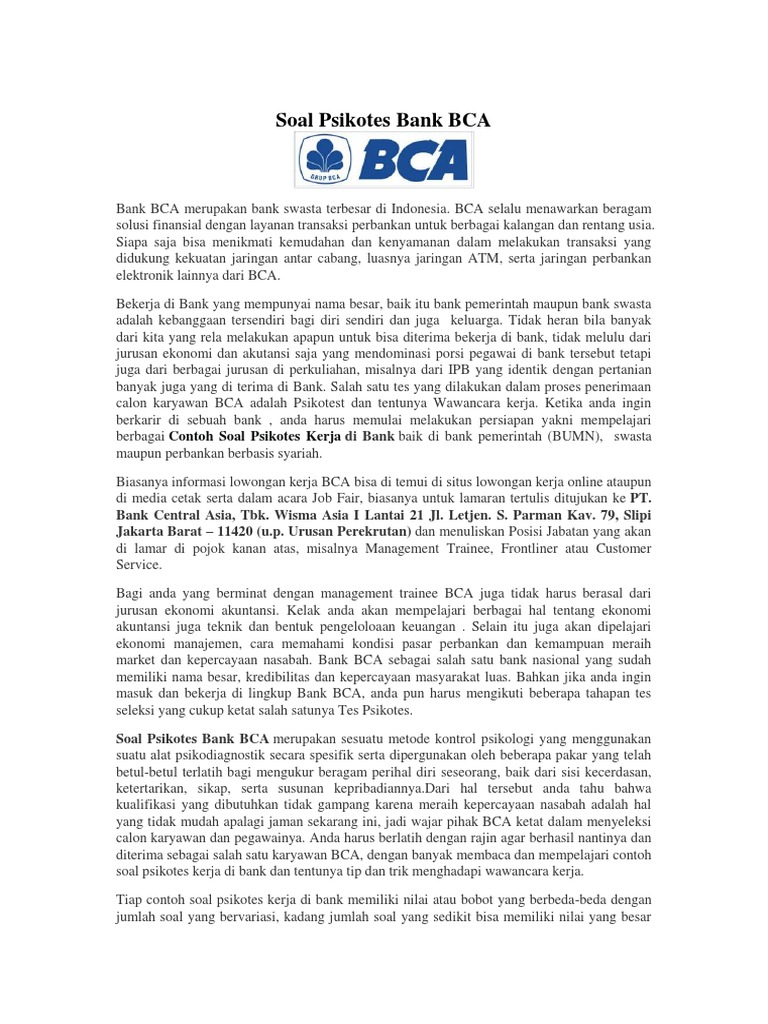 Soal Tes Online Magang Bakti Bca - Shopping Key PFF Dari tes online magang bakti bca sampai medical check up. Ini dia pertanyaan interview pengalaman magang bakti bca 2021. Contoh soal psikotes magang bakti bca 2018. Perlu dibayangin juga sih pas ngitungnya. Pengalaman tes magang bakti bca 2017. Soal psikotes bank cara mengerjakan psikotes. 1 tahap psikotes logika dan yang ke 2 lebih ke berhitung. 42 cara melamar pekerjaan di bank - Kelola Dana Anda Cara Menjawab Interview Di Bank - Tes Psikotes Cara menjawab interview bank berdasarkan pertanyaan di atas haruslah hati-hati. Pertanyaan di atas dimanfaatkan oleh pihak penguji guna mengetahui apakah anda yang hendak melamar pada bank tersebut sudah benar-benar paham dengan sistem kerja maupun produk yang dihasilkan atau hanyalah ikut-ikutan saja. 6 Pertanyaan Interview User dan Cara Menjawabnya - Glints Blog Pertanyaan ini merujuk bagaimana kamu dapat bekerja dalam tekanan, serta apakah kamu bisa multitasking.. Menurut Monster, kamu mungkin akan diberikan kondisi di mana kamu harus menyelesaikan banyak tugas di satu hari. Melalui pertanyaan interview ini, user ingin tahu bagaimana cara bekerja kamu secara profesional.Dalam menjawab pertanyaan ini, penting bagi kamu mempertimbangkan kekurangan dan ... Pengalaman Interview Psikotes Mitracomm dan Kisi - Kisi ... Untuk yang di tempatkan di Bank BCA, besoknya langsung di briefing oleh Mitracomm, karena kan dijadwalkan interview bersama user dari Bank BCA. Sementara untuk penempatan mitra lainnya disuruh untuk menunggu sampai nanti di panggil kembali.
