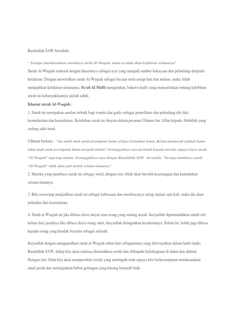 150 Caption untuk Sahabat yang Menyentuh ... - Dream.co.id 29. " Sahabat terbaik adalah orang-orang dalam hidupmu yang membuatmu tertawa lebih keras, tersenyum lebih cerah, dan hidup lebih baik." 30. " Terkadang bersama sahabatmu adalah terapi yang kamu butuhkan." 31. " Teman yang baik itu seperti semanggi berdaun empat; sulit ditemukan dan beruntung dimiliki." 32. duniailmu: Amalan Surat Al-Waqiah dan Fadhilah membacanya MANFAAT WIRID AL WAQI'AH : 1. Barangsiapa membaca surat Al- Waqi'ah pada setiap hari dan malam sebanyak 40 kali, selama 40 hari pula, maka Allah rezekinya mengalir terus dari berbagai penjuru. 2. Berpuasa selama seminggu dimulai pada hari Jumaat. Kisah Nyata Ini Buktikan Khasiat Dahsyat Surat Al-Waqiah ... Selain itu, setelah melakukan wirid Al Waqiah, ia berdoa seperti berikut: "Dengan keberkahan surat Al Waqiah saya memohon dan meminta kepada Mu ya Allah rezeki dan kekayaan yang berkah dan berlimpah." Ia mengulangi doa tersebut 3 kali. Setelah itu dia baca Surat Yasin satu kali dan surat Al Fatihah serta surat Al Ikhlas 11 kali.