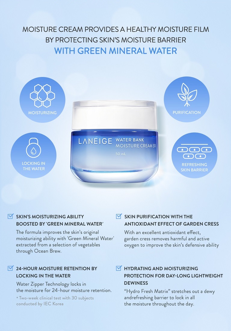 Laneige Water Bank Moisture Cream Review 2022 Buying Guide Laneige Water Bank Moisture Cream is one of the most famous and loved Korean moisturizers. It's been around for quite some time, and it's a rich cream that hydrates while improving brightness and texture. According to Laneige, it provides 24-hour hydration that soothes dry skin and restores the balanced facial complexion.