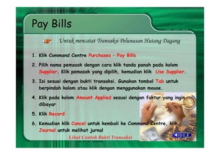 MENGENTRI BUKTI TRANSAKSI KE PROGRAM MYOB - Duniaku :) Untuk mencatat Transaksi Pelunasan Hutang Dagang 1. Klik Command Centre Purchases - Pay Bills 2. Pilih nama pemasok dengan cara klik tanda panah pada kolom Supplier. Klik pemasok yang dipilih, kemudian klik Use Supplier. 3. Isi sesuai dengan bukti transaksi. Gunakan tombol Tab untuk berpindah kolom atau klik dengan menggunakan mouse. 4.