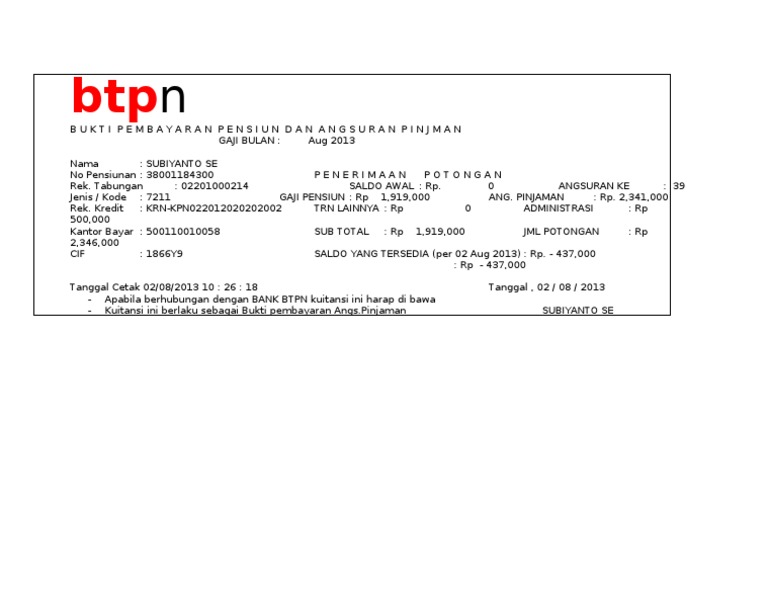 Bank Tabungan Pensiunan Nasional Bank Tabungan Pensiunan Nasional (BTPN) didirikan di Bandung pada 5 Februari 1958, yang awalnya bernama Bank Pegawai Pensiunan Militer (BAPEMIL) dengan status usaha sebagai badan perkumpulan yang menerima simpanan dan memberikan pinjaman kepada para anggotanya. Tabel Angsuran Pinjaman Bank BTPN 2021 - Kreditur.net Tabel Pinjaman Bank BTPN 2021 - Bank Tabungan Pensiunan Nasional (BTPN) adalah satu dari sekian banyak perbankan devisa di Indonesia. Sejak berdirinya, BTPN sangat terlihat jelas fokus pada pelayanan... abesu.org/apa-saja-syarat-pinjaman-kredit-pensiunan 3 Pinjaman Pensiunan Janda Terbaik 2022 Bank BTPN yang memang spesialisasi nya kredit pensiun menawarkan pinjaman untuk para pensiunan terusan janda atau duda. Menariknya, bunga yang ditawarkan adalah fixed atau bunga tetap dan tentunya sangat ringan. Untuk plafon kreditnya bisa mencapai 300 juta rupiah dengan tenor...