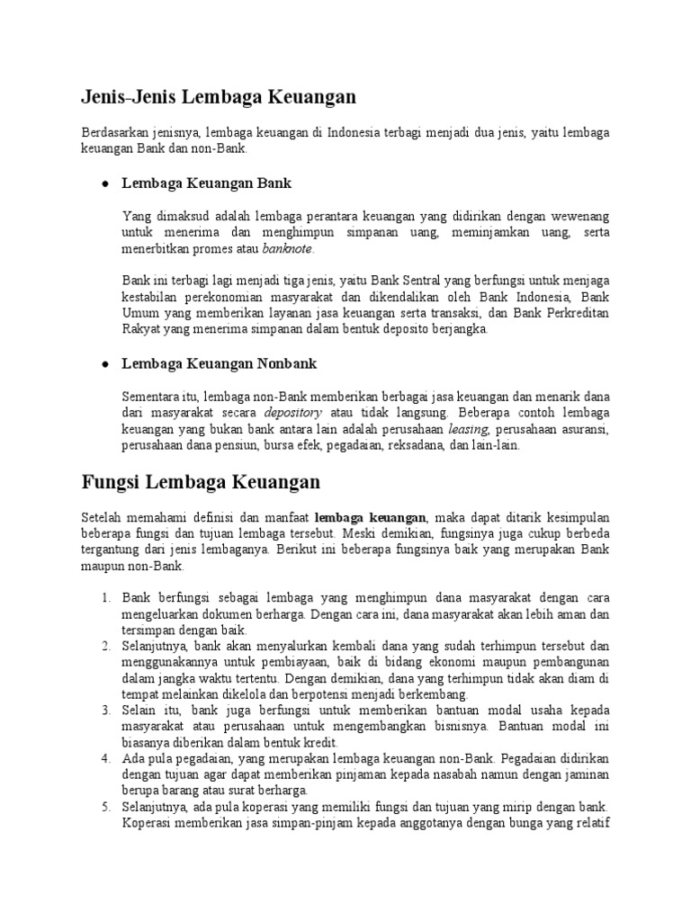 Lembaga Keuangan Bank: Pengertian, dan Jenis-Jenisnya Pengertian Lembaga Keuangan Bank. Apa yang dimaksud dengan lembaga keuangan Bank? Pengertian Lembaga Keuangan Bank adalah suatu badan usaha yang bergerak di bidang keuangan dimana kegiatannya menghimpun dana dari masyarakat secara langsung dan memberikan berbagai jasa keuangan kepada masyarakat luas.. Berdasarkan UU RI No. 10 tahun 1998 Tentang Perbankan, pengertian Bank adalah badan usaha ... Academics in Contoh Lembaga Keuangan Non Bank - Academia.edu View Academics in Contoh Lembaga Keuangan Non Bank on Academia.edu. Penggolongan Lembaga keuangan lembaga keuangan bank contoh ... Penggolongan Lembaga keuangan, lembaga keuangan bank, contoh lembaga keuangan bukan bank dan lembaga pembiayaan dapat dilihat pada tabel di bawah ini 46 Bank diambil dari kata banco, bahasa Italia, artinya meja.Dulu para penukar uang (money changer) melakukan pekerjaan mereka di pelabuhan-pelabuhan tempat para kelasi kapal datang dan pergi. Menurut catatan sejarah usaha perbankan sudah dikenal ... Lembaga Keuangan Bank - Pengertian, Kegiatan, dan Contoh Contoh lembaga keuangan bank adalah bank sentral, bank umum, dan bank perkreditan rakyat (BPR). Sementara contoh lembaga keuangan nonbank adalah perusahaan asuransi, perusahaan dana pensiun, koperasi simpan pinjam, lembaga gadai, hingga leasing. Apa fungsi lembaga keuangan bank? Beberapa fungsi yang dijalankan, yaitu: penyimpanan uang,