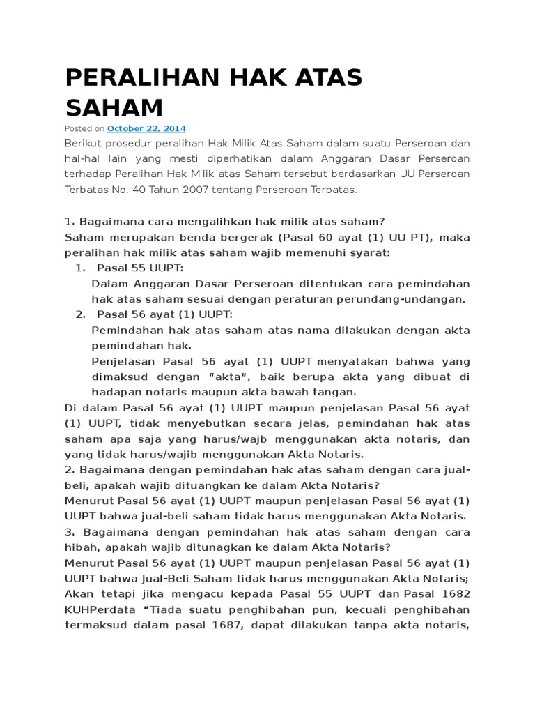 Ini Yang Harus Dilakukan Agar Pengalihan Saham Dapat ... Menurut Pasal 57 UUPT, pemindahan saham karena waris tidak diharuskan untuk menawarkan terlebih dahulu kepada pemegang saham lain dan mendapat persetujuan dari Rapat Umum Pemegang Saham (RUPS). Namun pewarisan saham tetap harus mendapat persetujuan dari instansi berwenang.