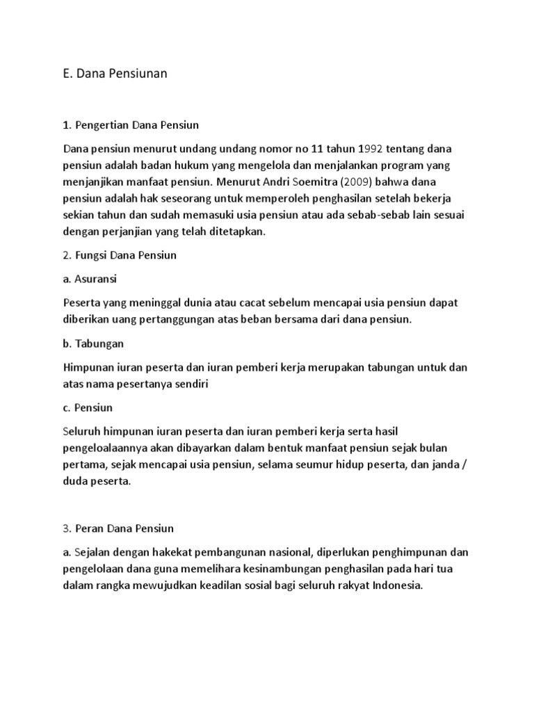BELAJAR DANA PENSIUN: Prinsip Penyelenggaraan Dana Pensiun Kekayaan Dana Pensiun Lembaga Keuangan dikecualikan dari setiap tuntutan hukum atas kekayaan Pendirinya. 6. Prinsip Struktur Pengendalian Intern. •. Tugas, kewajiban, dan tanggung jawab Pendiri, Mitra Pendiri, Dewan Pengawas, dan Pengurus diatur dalam Undang Undang Dana Pensiun dan peraturan pelaksanaannya. •. Pengertian Dana Pensiun: Fungsi, Tujuan, Jenis, Manfaat ... Tujuan Dana Pensiun 1. Perusahaan Kewajiban moral untuk memberi perusahaan rasa aman di masa depan tanpa khawatir tentang pendapatan pensiun. Loyalitas yang diharapkan perusahaan dari karyawan untuk menjadi sangat loyal kepada perusahaan dan bertujuan untuk meningkatkan motivasi karyawan ketika melakukan tugas sehari-hari. BAB V. MODUL EKONOMI X IPS 1-4 24 NOVEMBER.docx - Course Hero Dana Pensiun Lembaga Keuangan (DPLK) Merupakan lembaga dana pensiun yang dibentuk oleh bank atau perusahaan asuransi jiwa untuk menyelenggarakan program pensiun bagi masyarakat umum. 5. Prinsip kegiatan usaha dana pensiun : Adalah menghimpun dan mengelola dana guna memeliharaa kesinambungan penghasilan pada hari tua daalamrangka mewujudkan ...