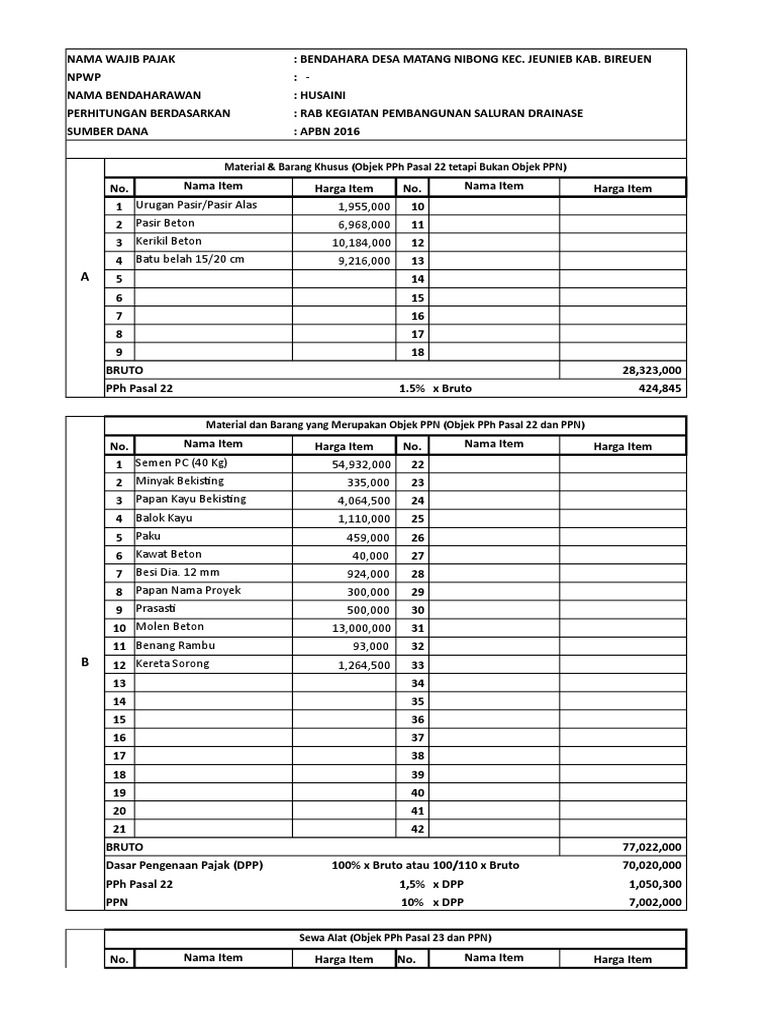 Solusi Perhitungan Pajak Bendahara Desa - Administrasi Desa May 18, 2019 · Pada kesempatan kali ini, admin akan membagikan beberapa solusi perhitungan pajak bendahara desa yang mana pembahasan kali ini sangat penting untuk ketertiban keajiban kita atas pajak dari sumber dana pendapatan. Bendahara desa dalam hal perpajakan merupakan bendahara pemerintah, di pemerintahan desa bendahara desa sekarang dijabat oleh kepala urusan keuangan/KAUR Keuangan. Pajak Atas Pembelian Kayu Oleh Bendahara ... - Tutorial Pajak Contoh Perhitungan Pajak atas Pembelian Kayu Oleh Bendahara Pemerintah. Untuk dapat lebih memahami terkait pemotongan dan/atau pemungutan pajak baik PPh 22 maupun PPN yang harus dikenakan atas transaksi pembelian kayu oleh bendahara, mari kita simak contohnya sebagai berikut. Bendahara dana DAK SDN 1 Kediri membeli kayu dari bapak Andi yang ... Konsultasi Pajak: Bagaimana Perhitungan Pajak Dana Desa? Aug 01, 2016 · Liputan6.com, Jakarta - Yth Konsultan Pajak, Bagaimana ketentuan pajak penggunaan dana desa yang bersumber dari APBN. Contoh kegiatannya adalah pembangunan jalan desa. Pertanyaan yang ingin kami sampaikan adalah: Apakah PPN dipotong langsung dari total jumlah anggaran kegiatan atau berdasarkan pembelian barang yang wajib kena pajak saja.