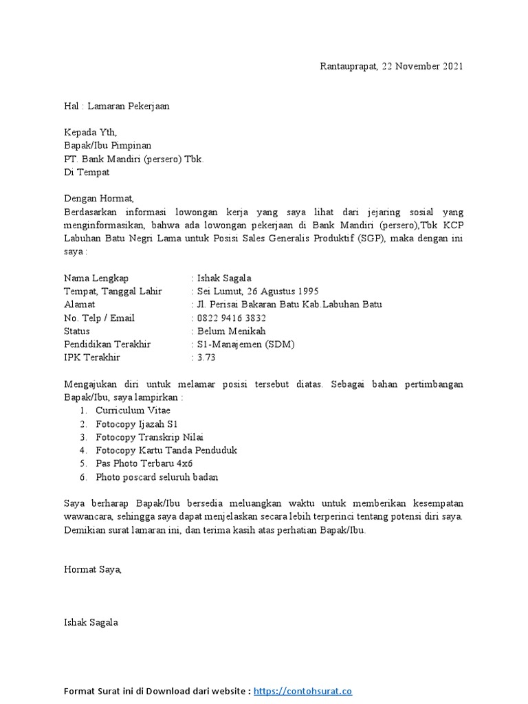 5 Contoh Surat Lamaran Kerja di Bank, Terbaru 2022 (Semua ... Kediri, 14 Oktober 2022. Hal : Lamaran Pekerjaan. Kepada Bapak/Ibu Staff Personalia Bank Mandiri. Berdasarkan informasi yang saya terima akan diadakannya walk interview lowongan kerja di Bank Mandiri cabang Surabaya pada tanggal 15-16 Oktober 2022, bersama surat ini saya bermaksud mengajukan untuk bekerja Bank Mandiri sebagai Custumer Service.. Mengenai data diri saya, dapat saya jelaskan ...