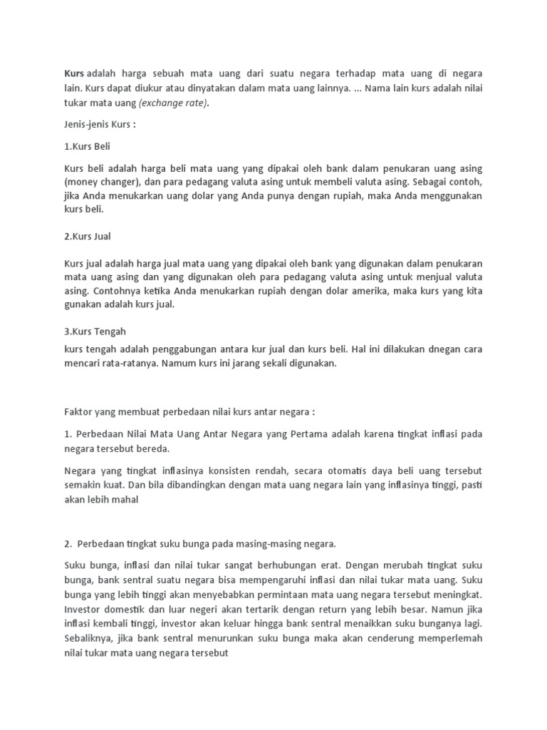 Mengenal Kurs & Jenis-Jenisnya dalam Pertukaran Mata Uang Kurs beli ini disebut juga sebagai kurs yang diberlakukan pedagang valas atau bank saat menjual mata uang negara asing kepada para pembeli. 3. Kurs Tengah Adalah jenis kurs di antara kurs jual dan beli (Kurs jual ditambah kus beli lalu di bagi dua atau kurs rata-rata) Berbagai Faktor yang Mempengaruhi Jenis Kurs yang Berlaku Kurs yang dipakai apabila seseorang membeli mata uang ... IPS Sekolah Menengah Pertama terjawab Kurs yang dipakai apabila seseorang membeli mata uang asing kepada bank disebut kurs ? 2 Lihat jawaban Iklan Jawaban 3.1 /5 12 citranf kurs beli. maaf kalo salah kurs beli itu jika kita menjual valuta asing ke bank Iklan Jawaban 4.3 /5 31 xxhkryxx kurs jual semoga membantu Iklan Ada pertanyaan lain? Tugas Softskill: LEMBAGA KEUANGAN NON BANK DAN BANK DI ... Sebagai Bank Sentral, Bank Indonesia diserahi tugas untuk mengatur neraca pembayaran Indonesia, sehingga penetapan kurs mata uang asing (valuta asing) harus dilakukan dengan pertimbangan-pertimbangan yang matang. Penyesuaian kurs mata uang rupiah terhadap mata uang asing harus dilakukan terus menerus, agar tidak terjadi penilaian yang terlau ...