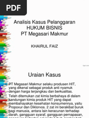 Kasus Hukum Membelit Gurita Bisnis Sari Roti - Tirto.ID Sari Roti cukup masif merambah pasar roti di domestik dengan ... (PDF) Kumpulan Kasus Cyber Crime di Indonesia | nur ... Pada bahasan kali ini diarahkan pada analisa beberapa kasus cyber crime yang pernah terjadi di wilayah hukum Republik Indonesia secara umum melalui sudut pandang Undang-undang ITE No. 11 Tahun 2008 , dan ataupun Undang-undang hukum pidana sebagai perangkat penunjang atas ditegakkannya Hukum tersebut. 1.4. Manfaat Penulisan a. contoh kasus pelanggaran etika bisnis yang dilakukan ... Perusahaan di dalam negeri (indonesia) yang pernah melanggar etika bisnis PT Megasari Makmur PT Megasari Makmur (di daerah gunung Putri, Bogor, Jawa Barat) Perjalanan obat nyamuk bermula pada tahun 1996, diproduksi oleh PT Megasari Makmur yang terletak di daerah Gunung Putri, Bogor, Jawa Barat. PT Megasari Makmur juga memproduksi banyak produk seperti tisu basah, dan…