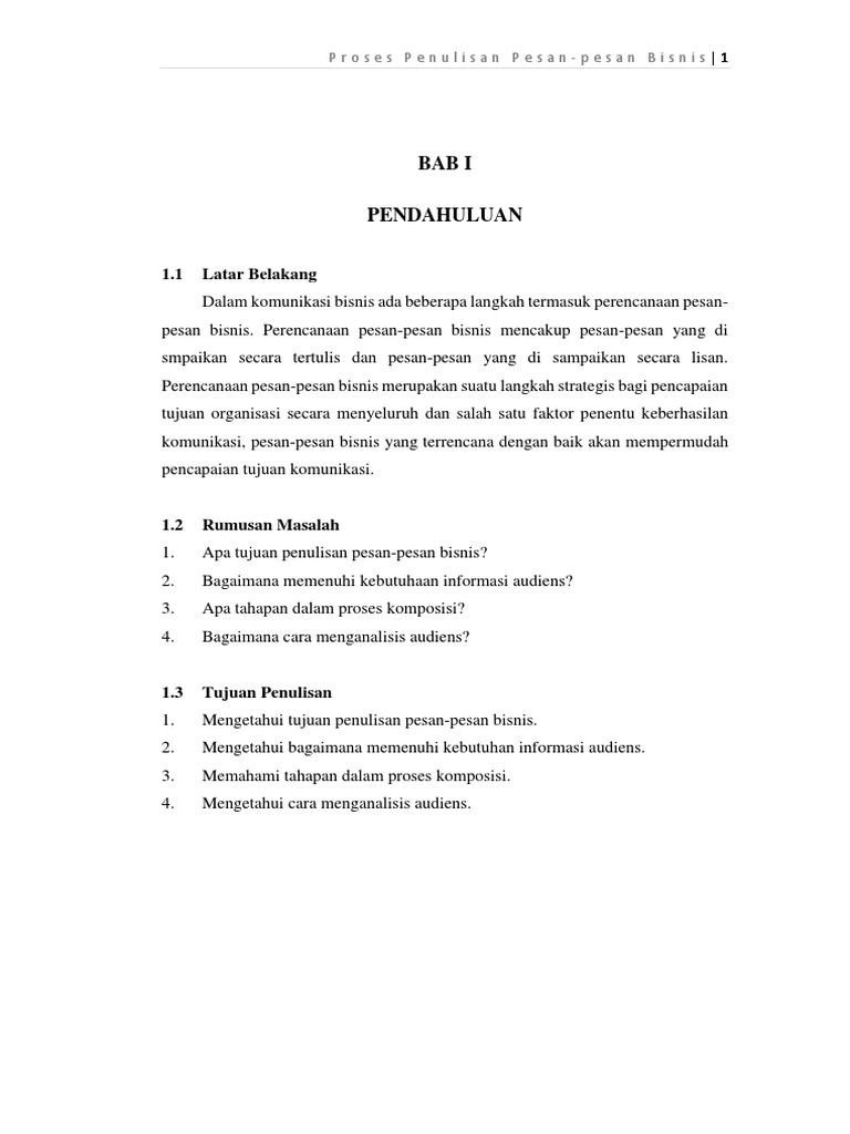 PDF PROSES PERENCANAAN PESAN BISNIS 1. Menetapkan Tujuan Pesan ... • Perencanaan pesan bisnis adalah proses penetapan berbagai kegiatan yang akan dilakukan sebelum pesan bisnis tersebut diluncurkan. •Purwanto (2006:69) proses perencanaan meliputi kegiatan; 1. Menentukan tujuan 2. Menganalisisaudiens 3. Menentukan ide pokok 4. Menyeleksi saluran dan media 1. Menetapkan Tujuan Pesan Bisnis MAKALAH PERENCANAAN PESAN - PESAN BISNIS - wuriadityo Perencanaan pesan-pesan bisnis merupakan suatu langkah strategis bagi pencapaian tujuan organisasi secara menyeluruh dan salah satu faktor prnrntu keberhasilan komunikasi, pesan-pesan bisnis yang terrencana dengan baik akan mempermudah pencapaian tujuan komunikasi. Perencanaan pesan komunikasi bisnis - SlideShare Penyusunan pesan-pesan bisnis meliputi tiga tahap : 1. Perencanaan Dalam fase perencanaan ( planning phase ), dipikirkan hal-hal yang cukup mendasar, seperti maksud/tujuan komunikasi, audiens yang akan menerima pesan, ide pokok (main idea) pesan-pesan yang akan disampiakan, dan slauran atau media yang akan digunakan untuk menyampaikan pesan. 2.