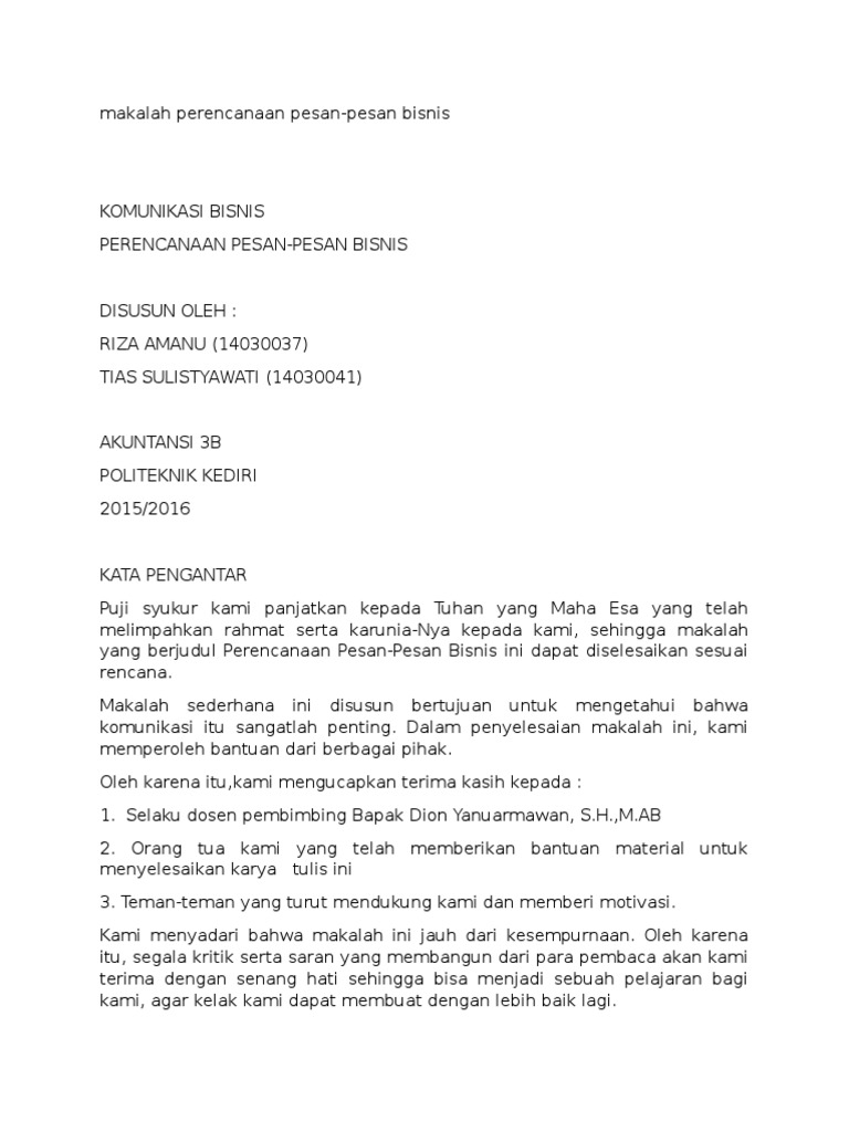 PERENCANAAN PESAN-PESAN BISNIS - munjiyatsyaiful Nov 06, 2017 · Perencanaan bisnis merupakan satu langkah strategis bagi pencaaian tujuan suatu organisasi secara menyeluruh. Pesan-pesan bisnis yang terencana dengan baik mempermudah pencapaian tujuan komunikasi. Penentuan tujuan yang jelas bagi suatu organisasi akan dapat membantu proses pengambilan keputusan yang mencakup antara lain : Contoh Pesan Bisnis dan Struktur Penyusunan yang Benar ... Struktur pesan bisnis yang pertama adalah perencanaan. Tentu saja kita tidak bisa asal-asalan dalam membuat dan mengirimkan pesan tersebut, karena akan berpengaruh pada citra perusahaan. Dalam tahap ini, ada beberapa hal yang harus diperhatikan, seperti: A. Tujuan Setiap hal yang ingin disampaikan akan berdasar pada sebuah tujuan. Proses Pembuatan Pesan - Pesan Bisnis - Komunikasi Bisnis Penyususunan pesan-pesan bisnis meliputi 3 tahap, yaitu : 1. Perencanaan. Daftar fase perencanaan (planning phase) dipikirkan hal-hal yang cukup mendasar, seperti maksud/tujuan komunikasi, audiens yang akan menerima pesan, ide pokok (main idea) pesan-pesan yang akan di sampaikan dan seluruh atau media yang akan digunakan menyampaikan pesan. Makalah PERENCANAAN PESAN-PESAN BISNIS - Make Better Than ... Penyususunan pesan-pesan bisnis meliputi 3 tahap, yaitu : 1. Perencanaan Daftar fase perencanaan (planning phase) dipikirkan hal-hal yang cukup mendasar, seperti maksud/tujuan komunikasi, audiens yang akan menerima pesan, ide pokok (main idea) pesan-pesan yang akan di sampaikan dan seluruh atau media yang akan digunakan menyampaikan pesan.