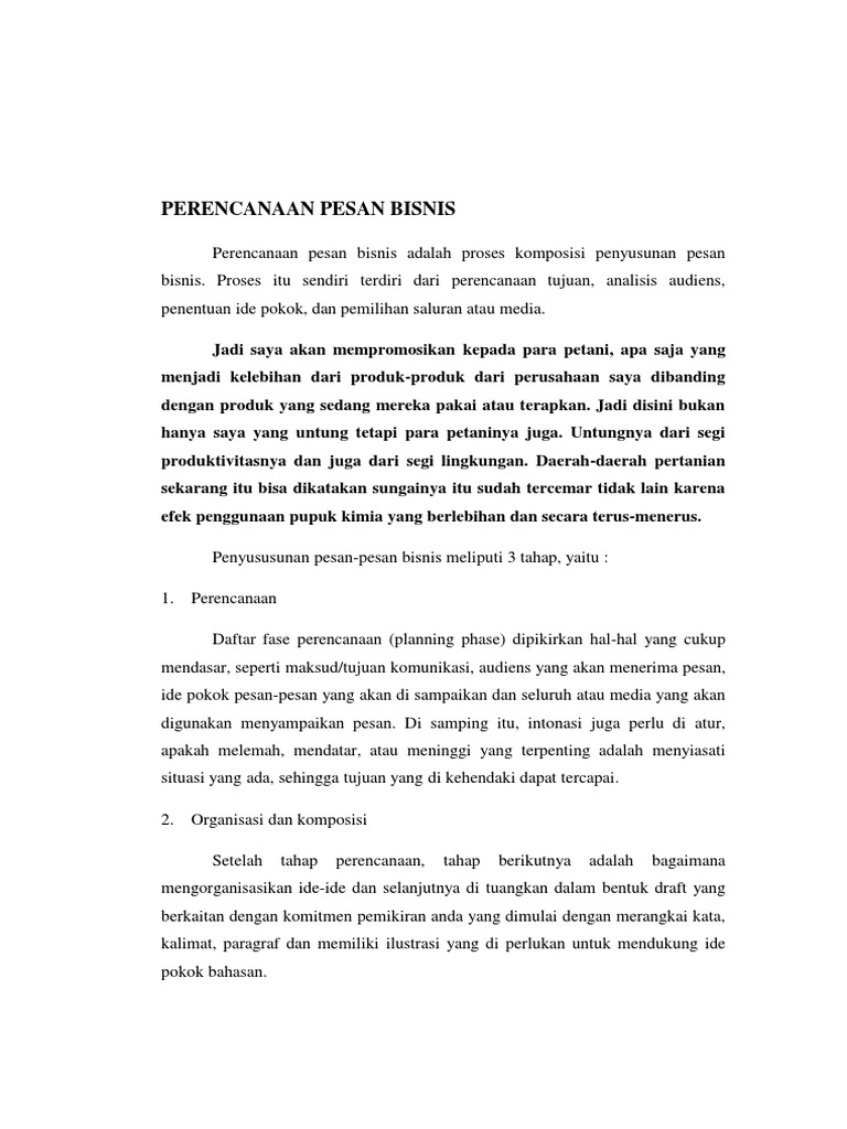 Contoh Perencanaan Pesan Bisnis - Kondisko Rabat Perencanaan pesan-pesan bisnis merupakan suatu langkah strategis bagi pencapaian tujuan organisasi secara menyeluruh dan salah satu faktor prnrntu keberhasilan komunikasi pesan-pesan bisnis yang terrencana dengan baik akan mempermudah pencapaian tujuan komunikasi. Pemilihan saluran dan media. PERANCANAAN PESAN BISNIS - All in One Blog Perencanaan pesan-pesan bisnis terdiri dari : Pemahaman Proses Komposisi Penyusunan proses komposisi seperti halnya proses menciptakan lagu; merencanakan lagu, membuat aransemen dan menentukan musisinya hinnga melakukan revisi-revisi hingga lagu enak didengar.