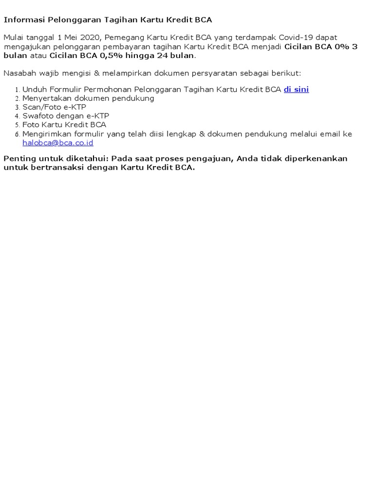 Cara Membuat Kartu Kredit BCA Agar Cepat Disetujui - Finder ... Pernyataan bahwa BCA telah menerima pengajuan aplikasi kartu kredit Nomor registrasi pengajuan aplikasi Petunjuk untuk mencetak surat konfirmasi aplikasi, serta dokumen persyaratan yang diperlukan. Oleh sebab itu, langkah selanjutnya adalah menyiapkan dokumen persyaratan, disertai surat konfirmasi yang telah dicetak dan ditandatangani.