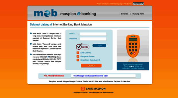 Internet Banking - Bank Maspion MEB (Maspion E-Banking) adalah jasa layanan e-banking dari Bank yang meliputi Internet Banking dan Mobile Banking yang disediakan Bank bagi Nasabah untuk melakukan aktifitas terhadap rekening di Bank melalui jaringan internet.