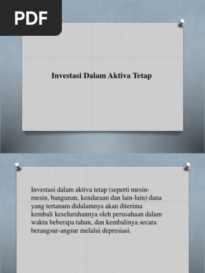 Investasi dalam aktiva tetap. INVESTASI DALAM AKTIVA TETAP - YouTube INVESTASI DALAM AKTIVA TETAP PDF Analisis Kelayakan Investasi Aktiva Tetap Pembelian Mesin Printing Pada Pt. Radja ... d. Investasi lain-lain Aktiva Tetap Aktiva tetap adalah aktiva berwujud yang digunakan dalam operasi perusahaan dan tidak dimaksudkan untuk dijual dalam rangka kegiatan normal perusahaan. (Yusuf,2001:153) Baridwan (2000: 22) dalam bukunya menyatakan aktiva tetap adalah Penjelasan Aktiva Tetap Dan Contohnya Dalam Perusahaan Sebagai aset atau kekayaan tetap sebuah perusahaan, aktiva tetap memiliki beberapa karakteristik, yaitu sebagai berikut: 1. Tidak untuk dijual kembali. 2. Memiliki wujud fisik. 3. Memiliki nilai material yang cukup dan harga dari aset yang signifikan (harga tanah, harga mesin, harga bangunan, dan lain sebagainya) 4. 3. investasi dalam aktiva tetap - slideshare.net Perputaran dana dalam aktiva Tetap Jumlah dana yg diinvestasikan dalam aktiva tetap tidak sama jumlahnya selama periode investasi atau selma umur penggunaan aktiva tetap tersebut. Jumlahnya berangsur-angsur berkurang sesuai metode depresiasi yang digunakan,. Misalnya: bagunan dibeli dengan harga perolehan sebesar Rp. 100 juta, umur ekonomisnya ...