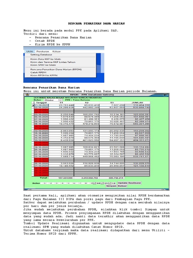 Rencana Penarikan Dana Harian (RPD Harian/APS) - KPPN Metro Guna mendukung kelancaran pelaksanaan anggaran tahun 2021 melalui proyeksi kas yang lebih baik, Rencana Penarikan Dana (RPD) sesuai dengan Peraturan Menteri Keuangan Nomor 197/PMK.05/2017 diterapkan kembali dengan ketentuan sebagai berikut: Satuan Kerja (Satker) menyusun RPD bulanan sesuai dengan halaman III 4_Penyusunan Rencana Kegiatan dan Penarikan Dana - Unduh Buku | 1-22 Halaman ... penyusunan rencana pelaksanaan kegiatan dan rencana penarikan dana tabel 10 kalender kegiatan satker kemudian satker menjabarkan kalender kegiatan harian untuk tiga bulan kedepan dengan format sebagai berikut: tabel 11 kalender kegiatan harian format kalender kegiatan di atas dapat disusun dengan berbagai format yang berbeda, namun esensinya sama … 16+ Contoh Surat Pengajuan Dana : Oprasional, Bendaharan dan Lainnya Contoh Surat Pengajuan Dana - Urusan dana atau keuangan merupakan hal yang sangat krusial bagi semua pihak. Tidak terkecuali di perusahaan, instansi, ataupun lembaga - lembaga pemerintah dan swasta. Semua biaya dan pengeluaran harus dicatat dengan baik dan benar, dan bisa dipertanggung jawabkan oleh pihak yang bersangkutan.