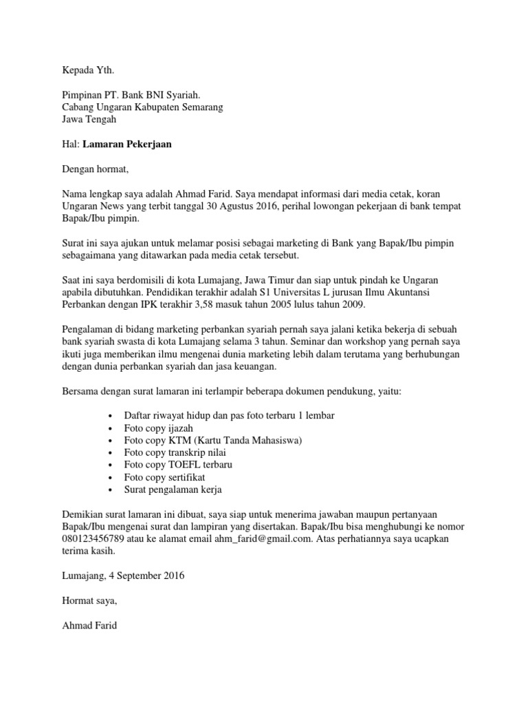13+ Contoh surat lamaran kerja bank BNI - Contoh Surat Contoh surat lamaran kerja bank BNI adalah sebuah contoh surat lamaran kerja yang digunakan untuk melamar pekerjaan di bank BNI, Bank BNI adalah bank pemerintah yang dipimpin oleh seorang direktur, anak perusahaan bank BNI adalah Bank BNI Syariah, BNI Life, PT BNI Sekuritas, Graha Sahari Surya Jaya. Bekerja di salah satu bank terbesar di Indonesia yaitu bekerja di Bank BNI merupakan pekerjaan ...