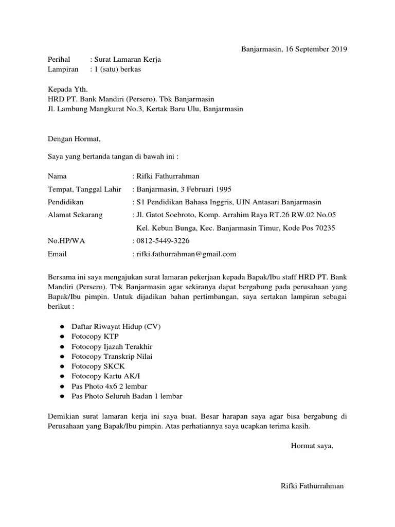 Contoh Surat Lamaran Kerja Di Bank untuk Fresh Graduated ... Saya juga cantumkan beberapa contoh bank tujuan seperti Bank Mandiri, BRI, BNI, BI dan Bank-Bank Swasta lainnya. Adapun contoh surat lamaran kerjanya sebagai berikut : 1. Contoh Surat Lamaran Kerja di Bank Mandiri. Malang, 11 November 2022. Hal : Lamaran Pekerjaan. Lampiran : 7 Lembar.